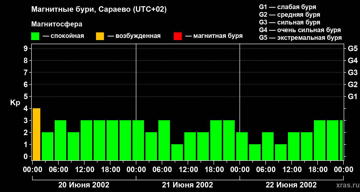 Изменения геомагнитного индекса Kp с 20 по 22 июня 2002 года для средних широт