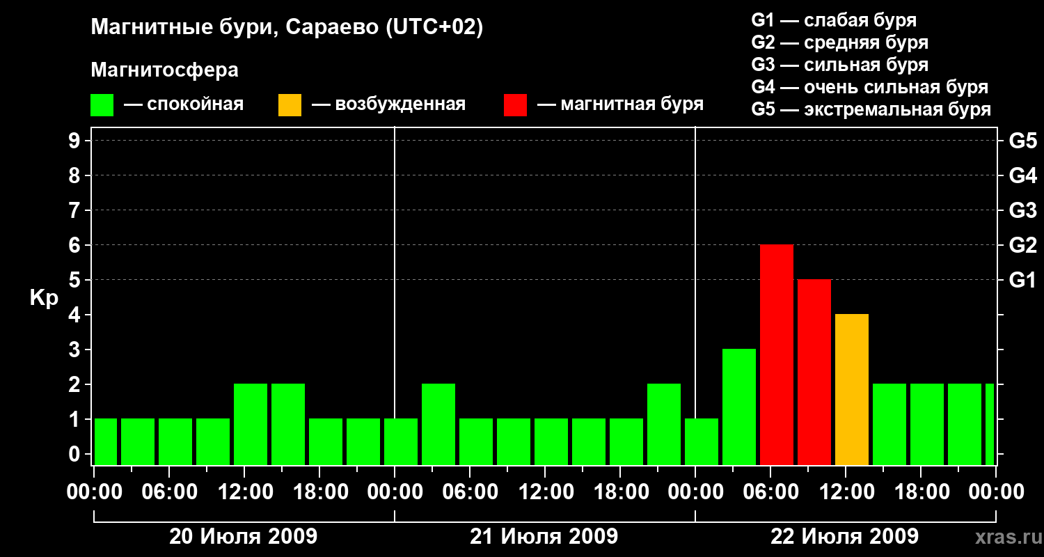 Изменения геомагнитного индекса Kp с 20 по 22 июля 2009 года для средних широт
