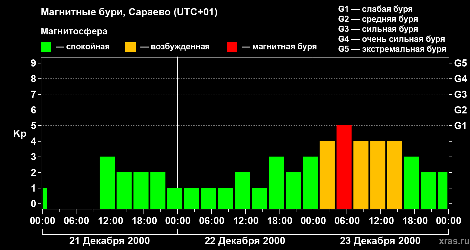 Изменения геомагнитного индекса Kp с 21 по 23 декабря 2000 года для средних широт