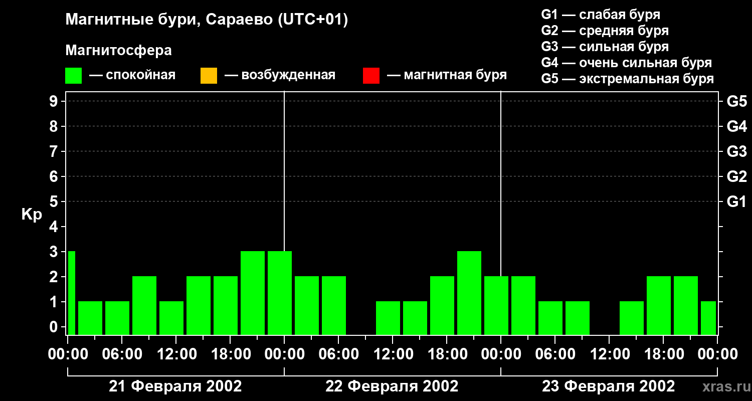 Изменения геомагнитного индекса Kp с 21 по 23 февраля 2002 года для средних широт