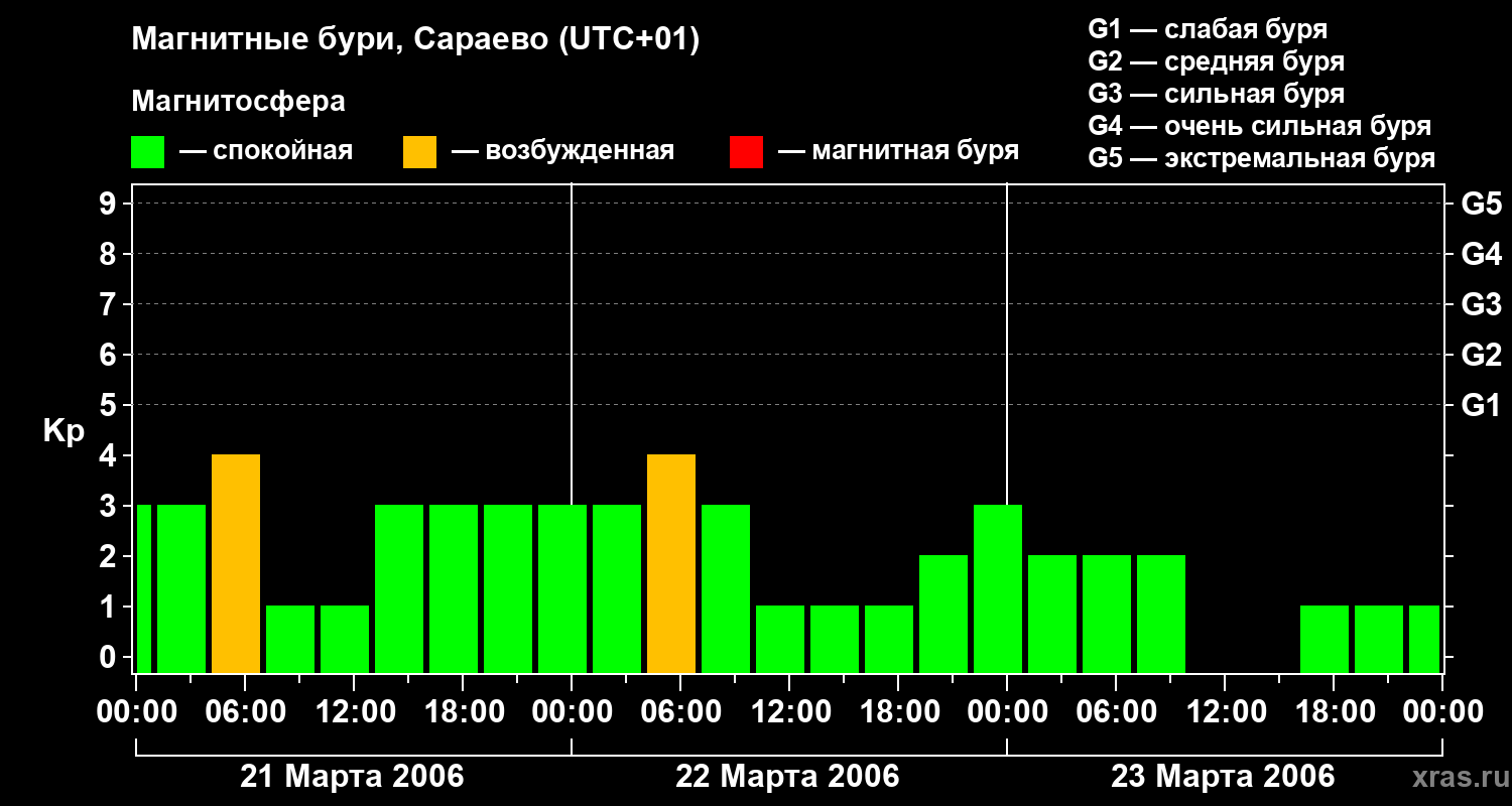 Изменения геомагнитного индекса Kp с 21 по 23 марта 2006 года для средних широт