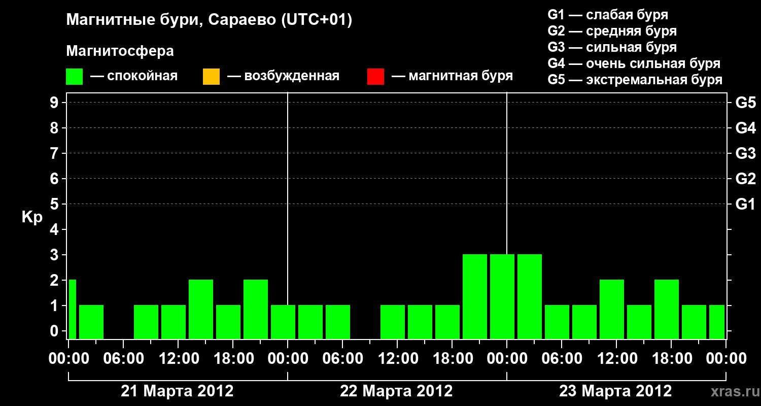 Изменения геомагнитного индекса Kp с 21 по 23 марта 2012 года для средних широт