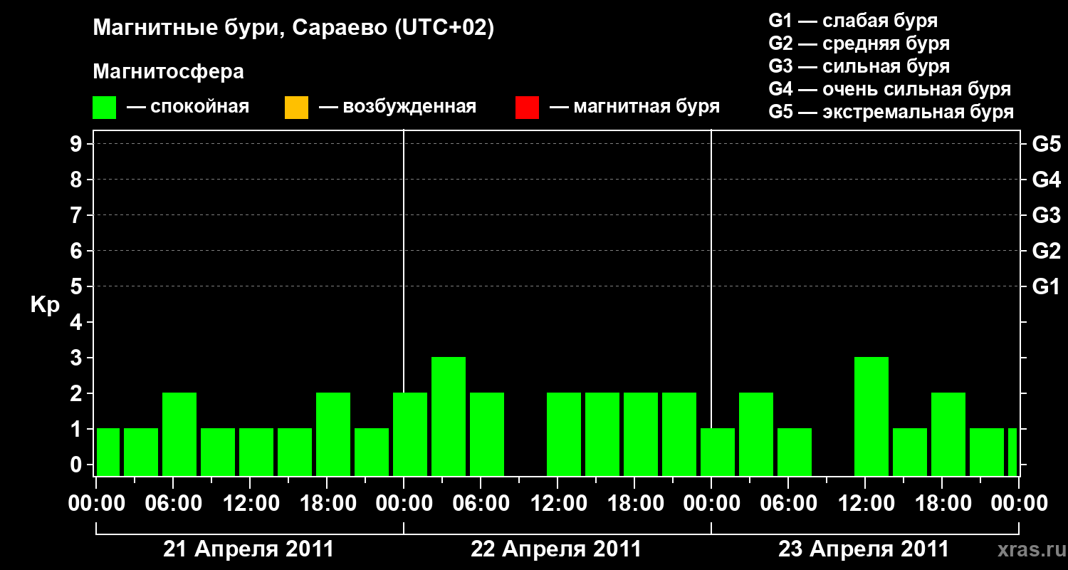 Изменения геомагнитного индекса Kp с 21 по 23 апреля 2011 года для средних широт