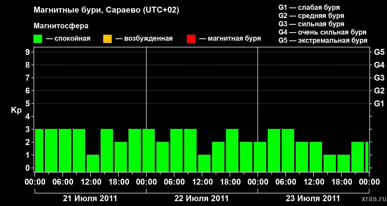 Изменения геомагнитного индекса Kp с 21 по 23 июля 2011 года для средних широт