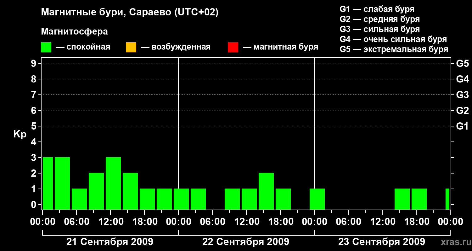 Изменения геомагнитного индекса Kp с 21 по 23 сентября 2009 года для средних широт