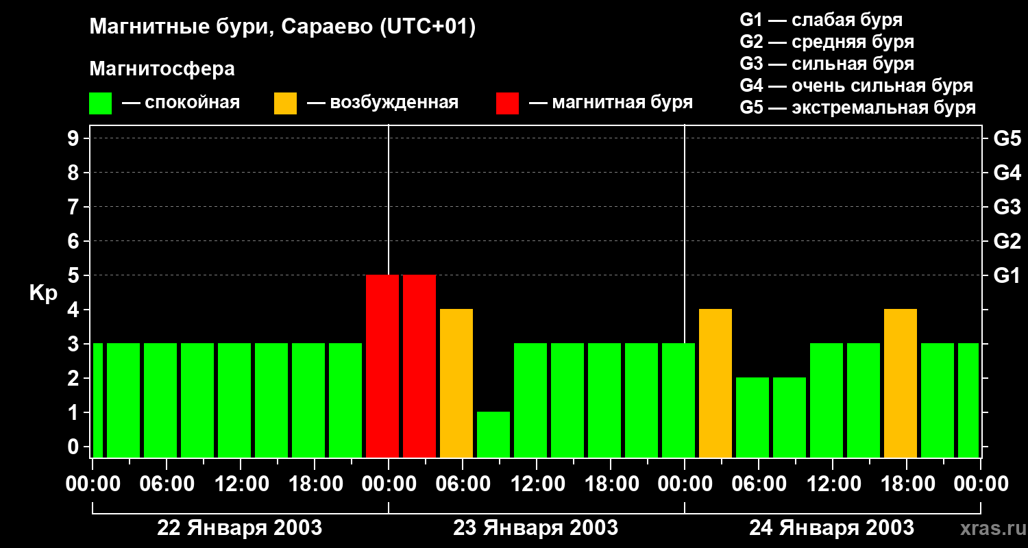 Изменения геомагнитного индекса Kp с 22 по 24 января 2003 года для средних широт