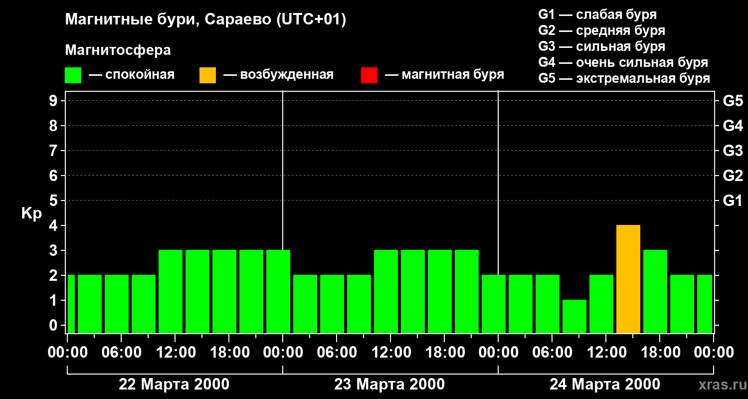 Изменения геомагнитного индекса Kp с 22 по 24 марта 2000 года для средних широт