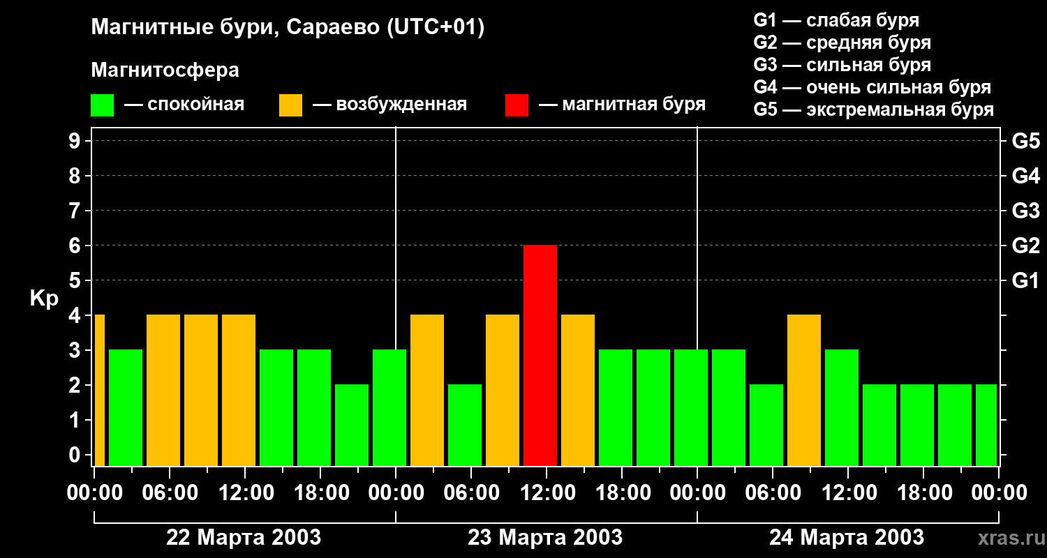 Изменения геомагнитного индекса Kp с 22 по 24 марта 2003 года для средних широт