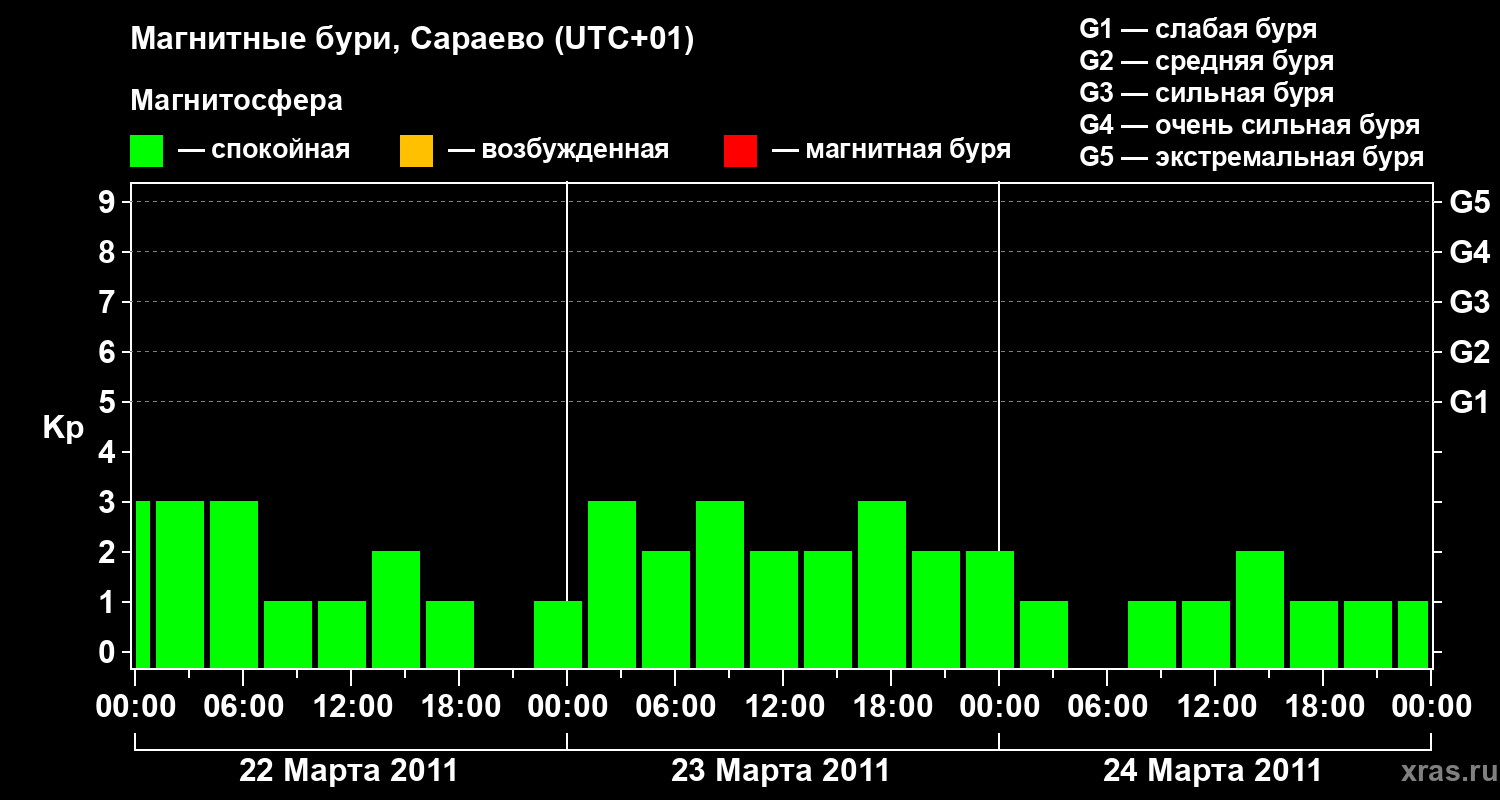 Изменения геомагнитного индекса Kp с 22 по 24 марта 2011 года для средних широт