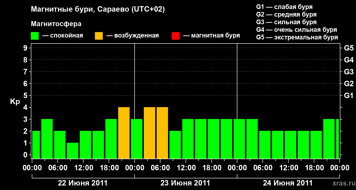 Изменения геомагнитного индекса Kp с 22 по 24 июня 2011 года для средних широт