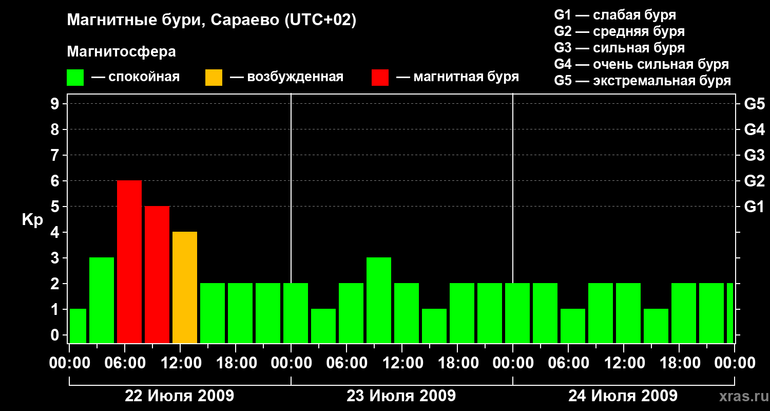 Изменения геомагнитного индекса Kp с 22 по 24 июля 2009 года для средних широт