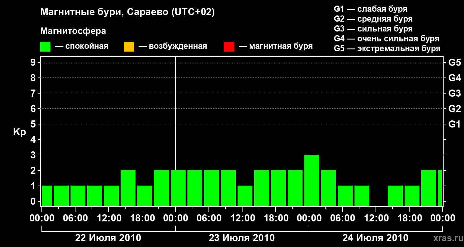 Изменения геомагнитного индекса Kp с 22 по 24 июля 2010 года для средних широт