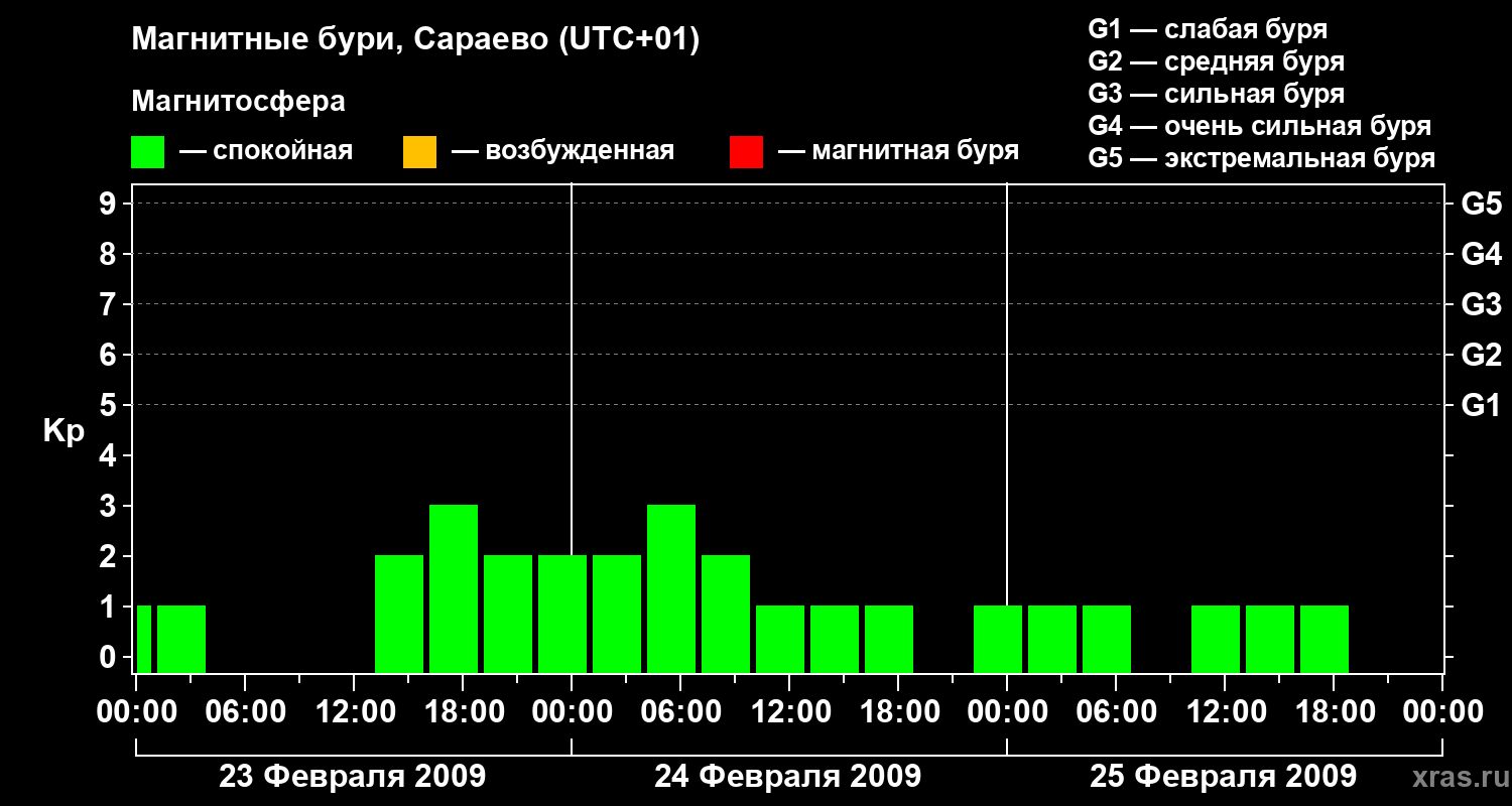 Изменения геомагнитного индекса Kp с 23 по 25 февраля 2009 года для средних широт