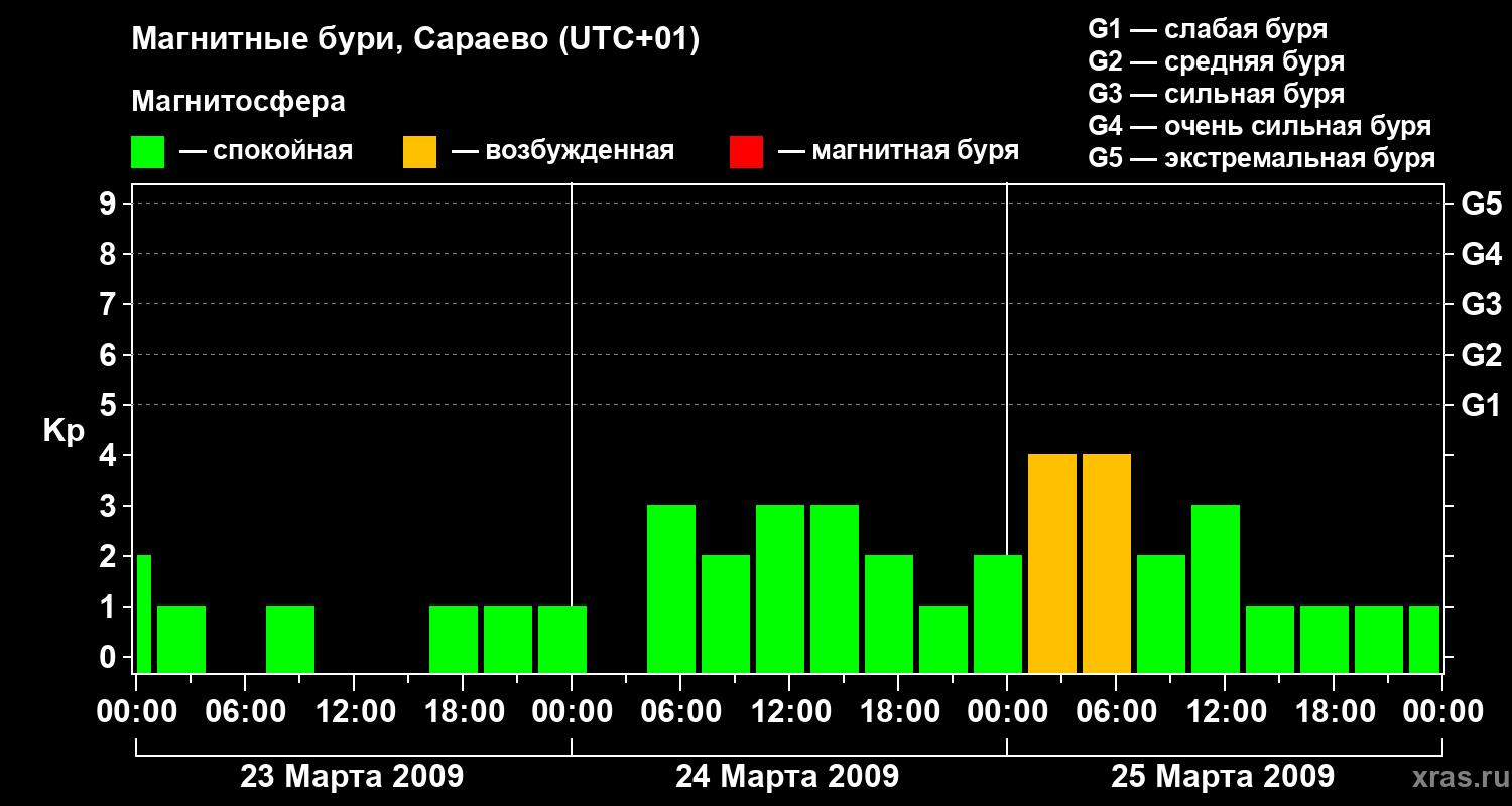 Изменения геомагнитного индекса Kp с 23 по 25 марта 2009 года для средних широт