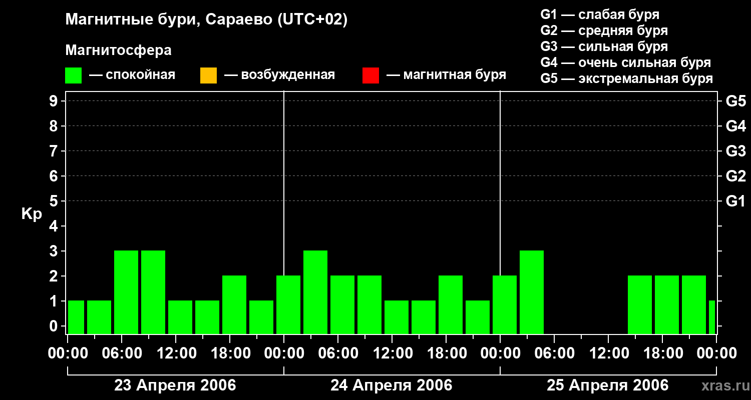 Изменения геомагнитного индекса Kp с 23 по 25 апреля 2006 года для средних широт