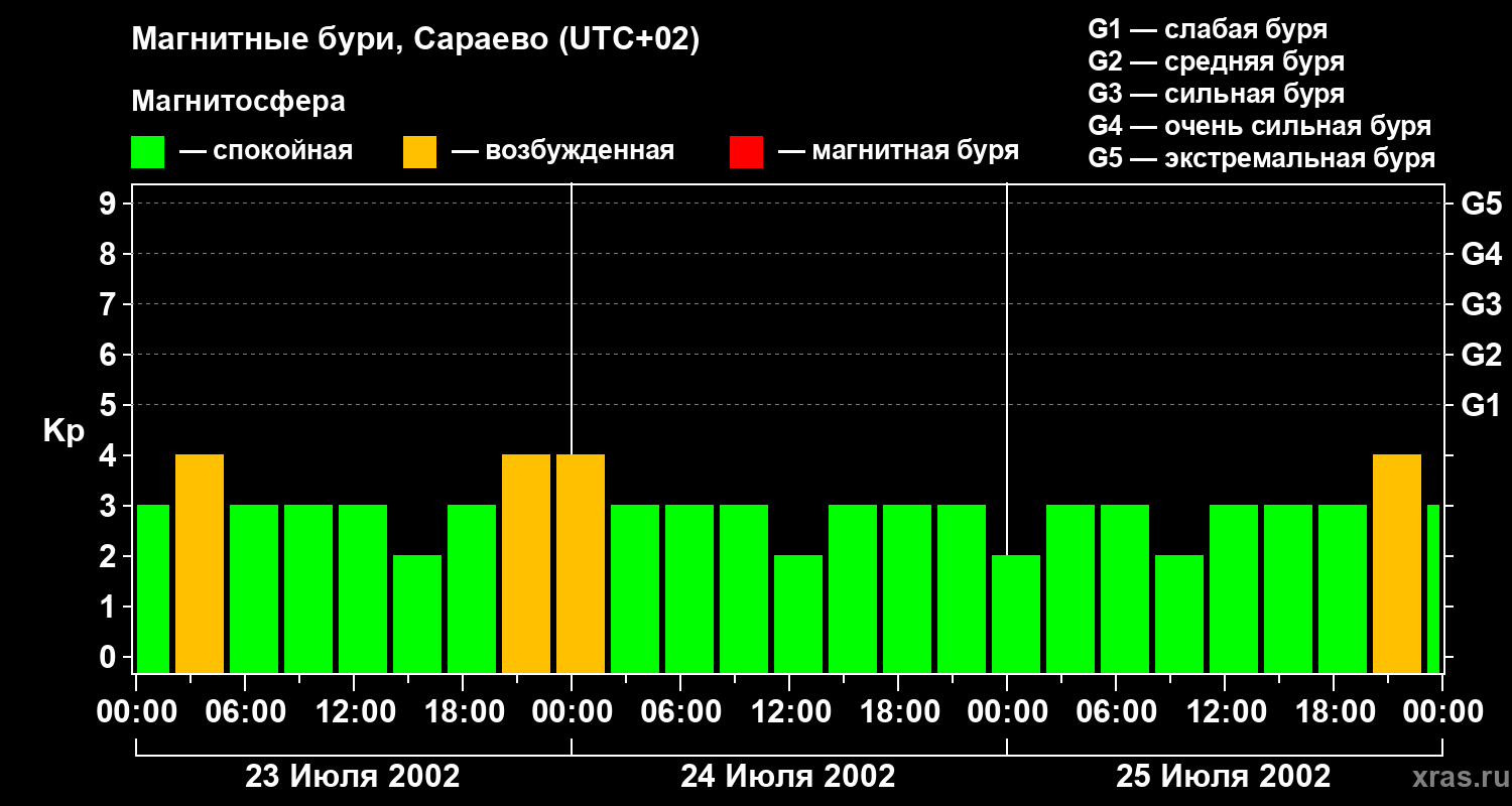 Изменения геомагнитного индекса Kp с 23 по 25 июля 2002 года для средних широт