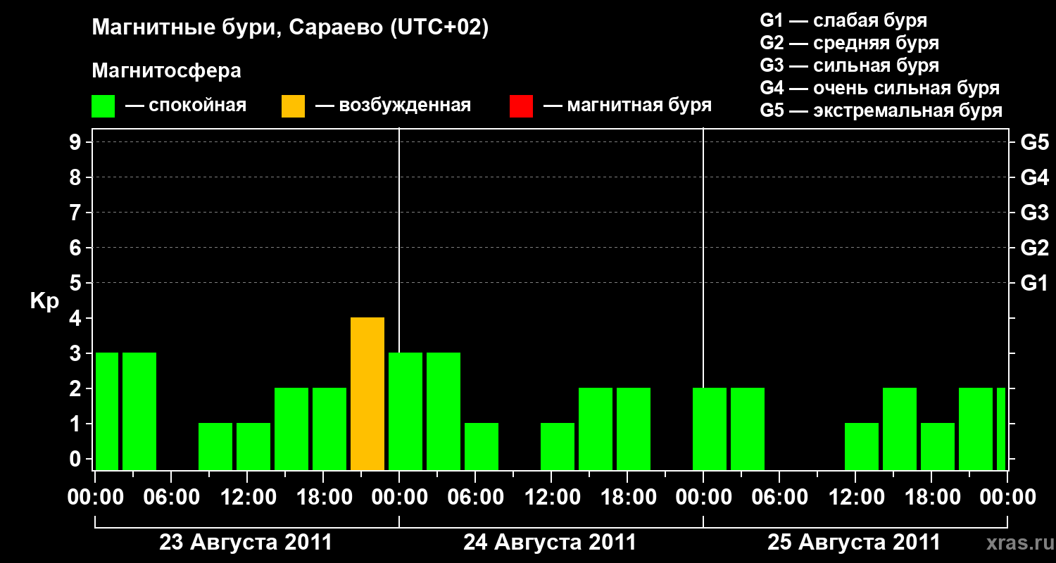 Изменения геомагнитного индекса Kp с 23 по 25 августа 2011 года для средних широт