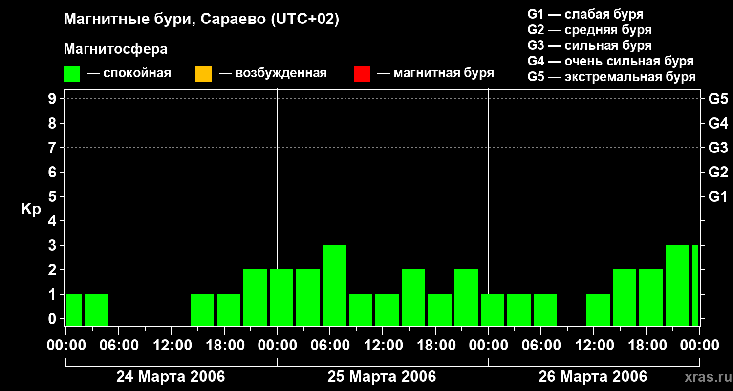 Изменения геомагнитного индекса Kp с 24 по 26 марта 2006 года для средних широт