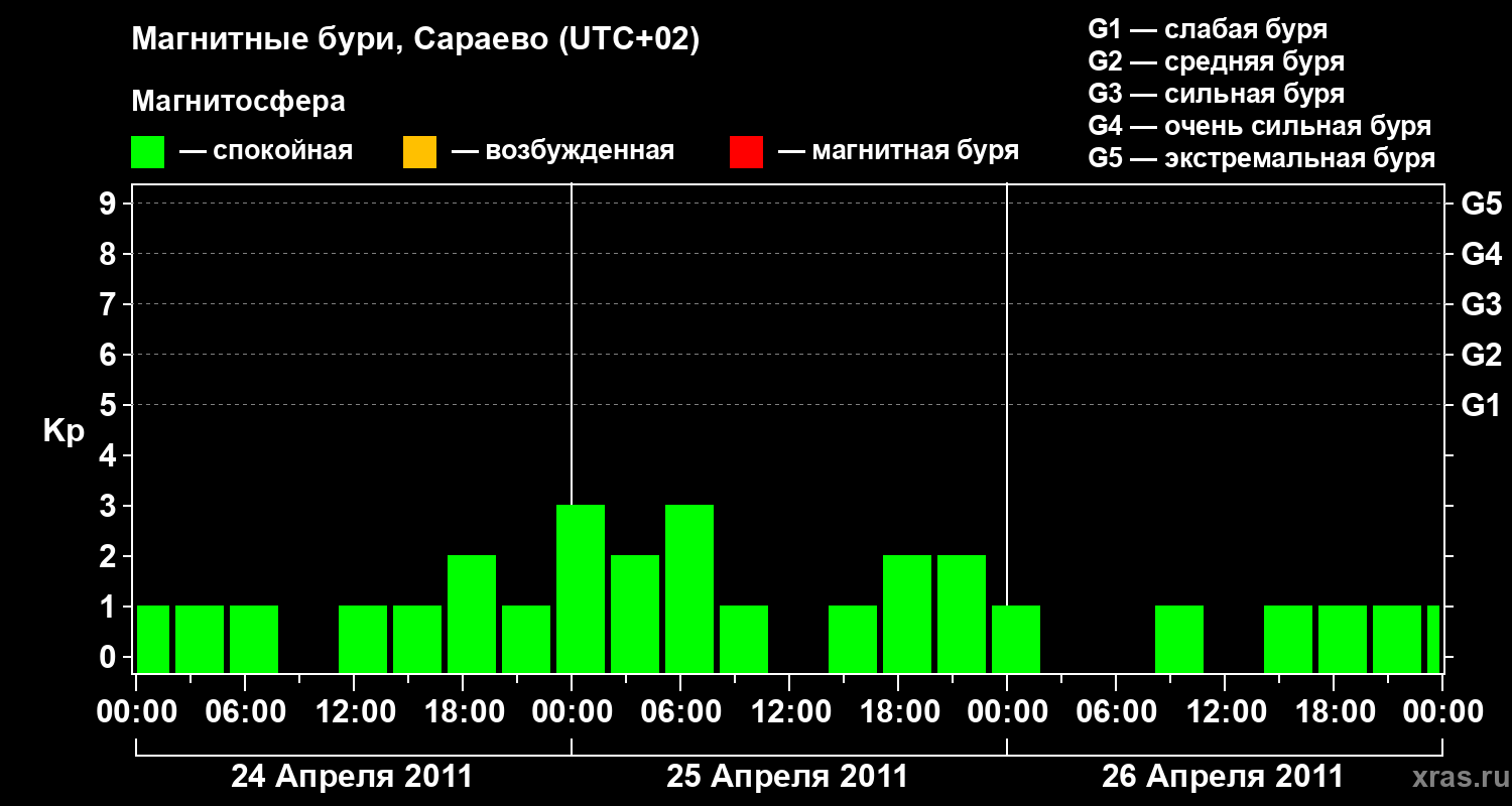 Изменения геомагнитного индекса Kp с 24 по 26 апреля 2011 года для средних широт