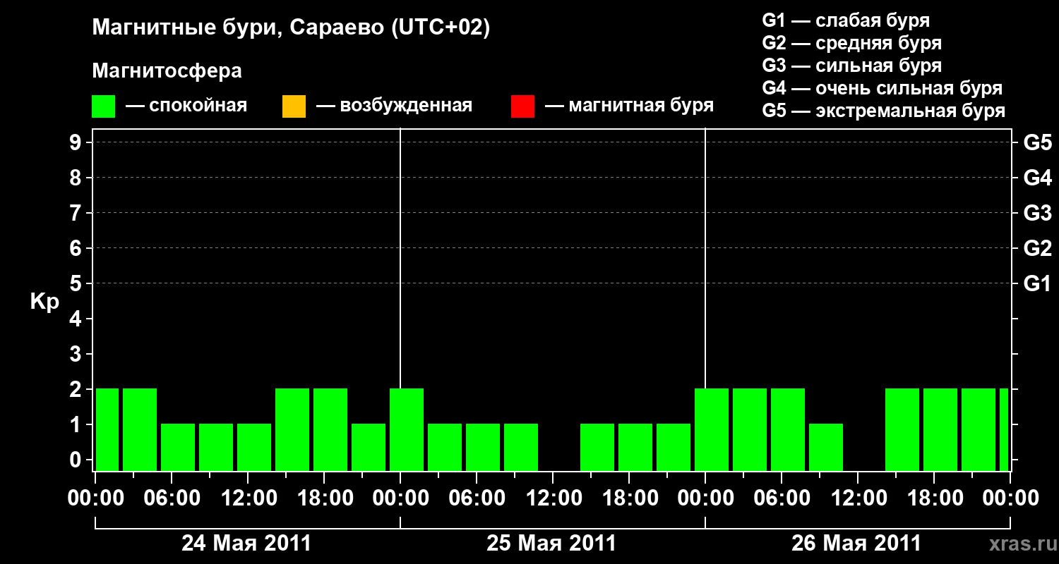 Изменения геомагнитного индекса Kp с 24 по 26 мая 2011 года для средних широт