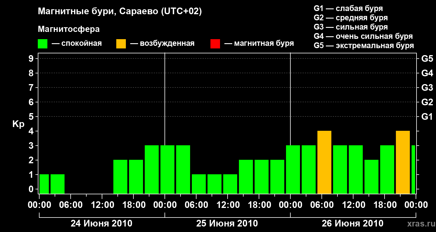Изменения геомагнитного индекса Kp с 24 по 26 июня 2010 года для средних широт