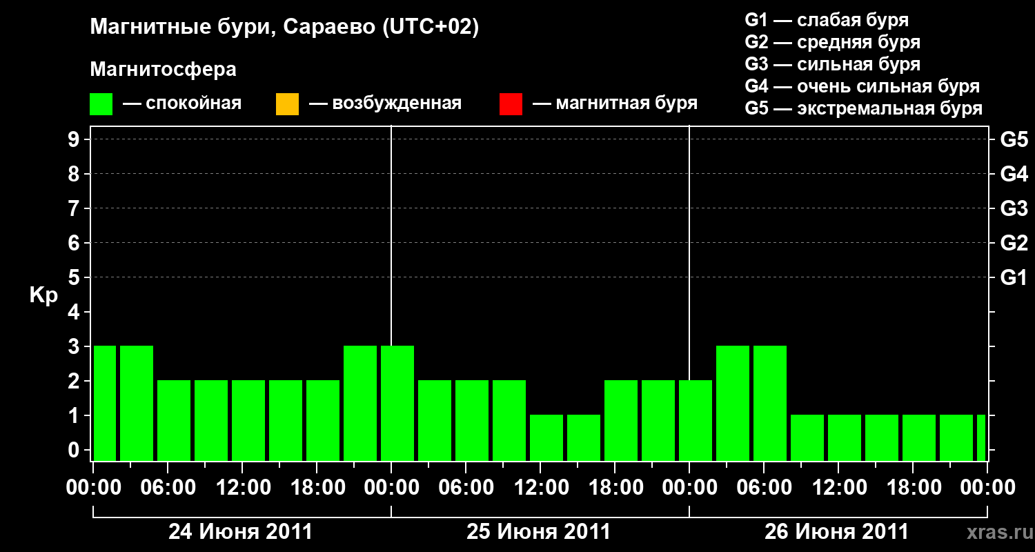Изменения геомагнитного индекса Kp с 24 по 26 июня 2011 года для средних широт