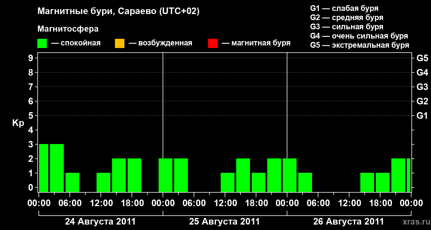 Изменения геомагнитного индекса Kp с 24 по 26 августа 2011 года для средних широт