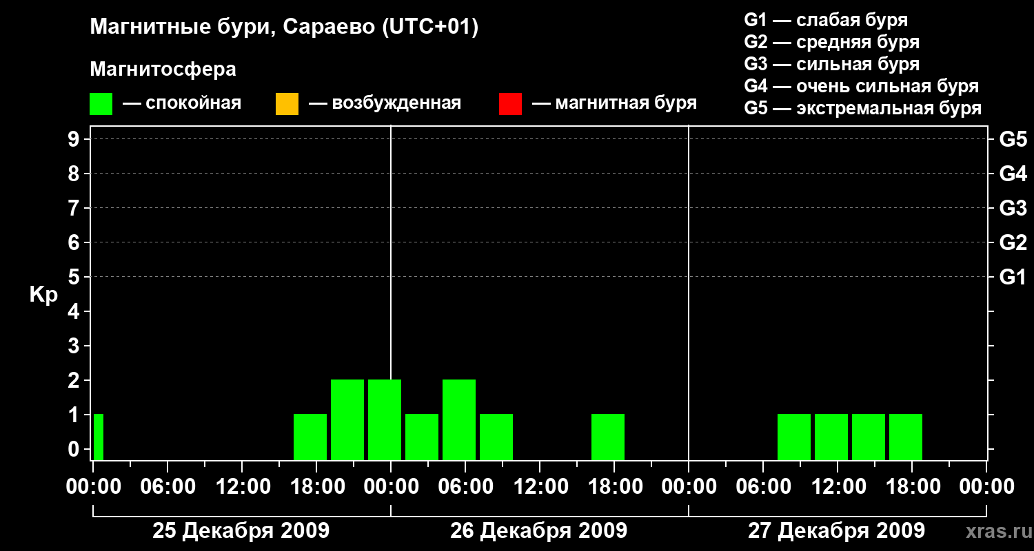 Изменения геомагнитного индекса Kp с 25 по 27 декабря 2009 года для средних широт