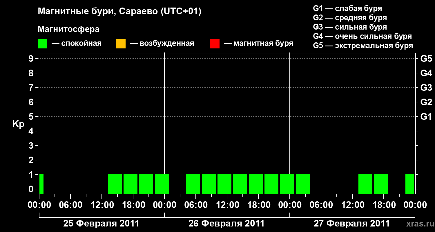 Изменения геомагнитного индекса Kp с 25 по 27 февраля 2011 года для средних широт