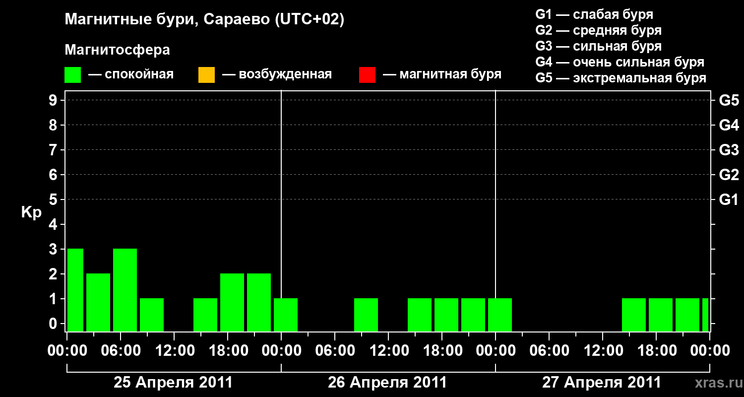 Изменения геомагнитного индекса Kp с 25 по 27 апреля 2011 года для средних широт