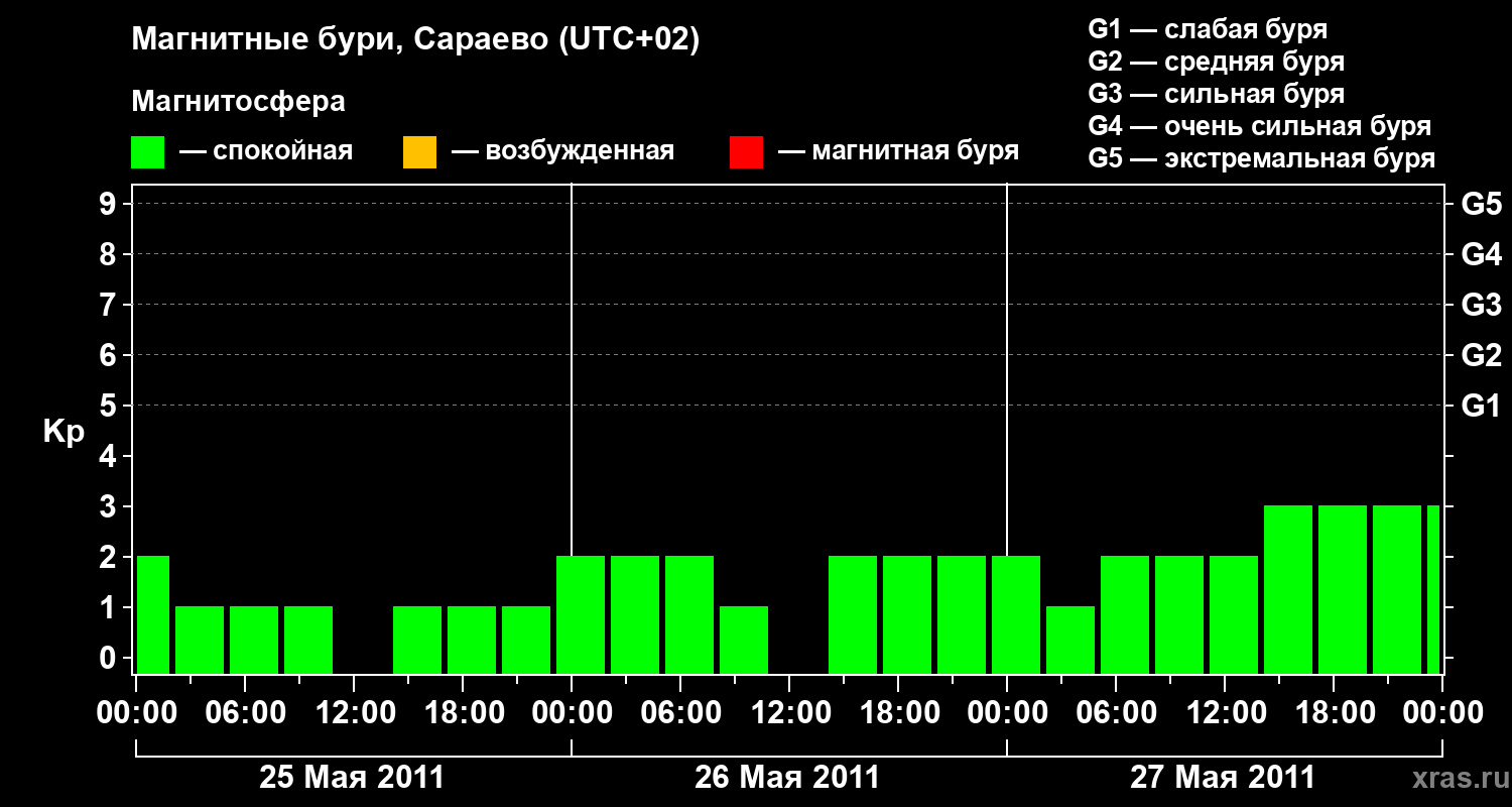 Изменения геомагнитного индекса Kp с 25 по 27 мая 2011 года для средних широт