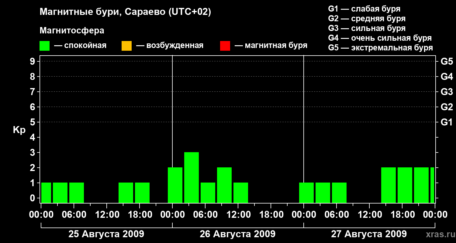 Изменения геомагнитного индекса Kp с 25 по 27 августа 2009 года для средних широт