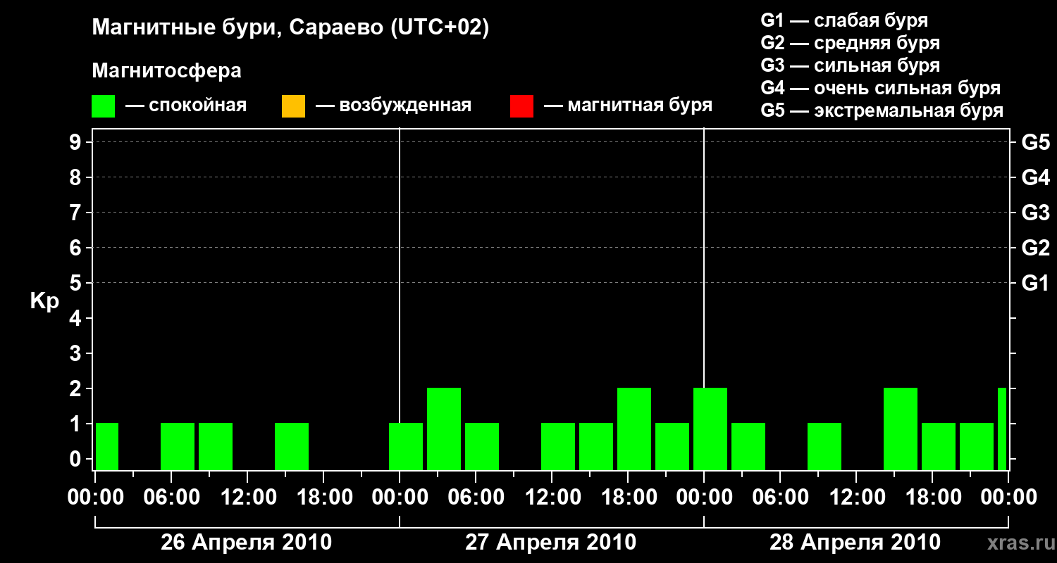 Изменения геомагнитного индекса Kp с 26 по 28 апреля 2010 года для средних широт