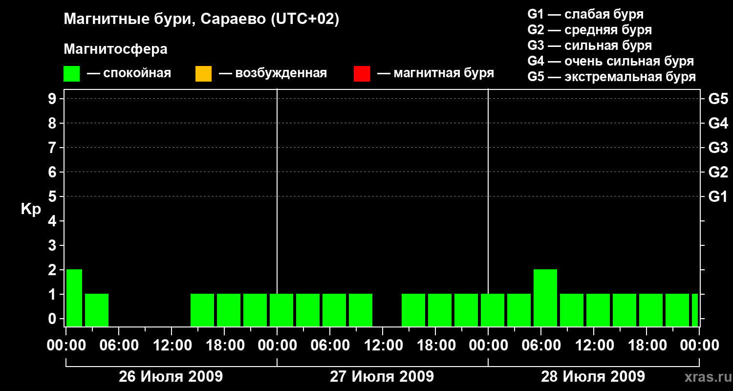 Изменения геомагнитного индекса Kp с 26 по 28 июля 2009 года для средних широт