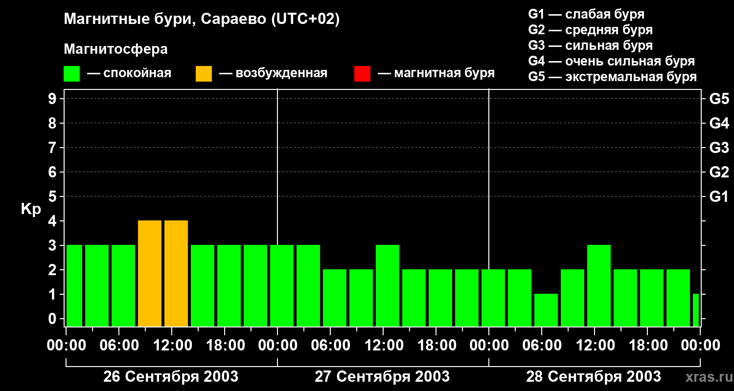 Изменения геомагнитного индекса Kp с 26 по 28 сентября 2003 года для средних широт