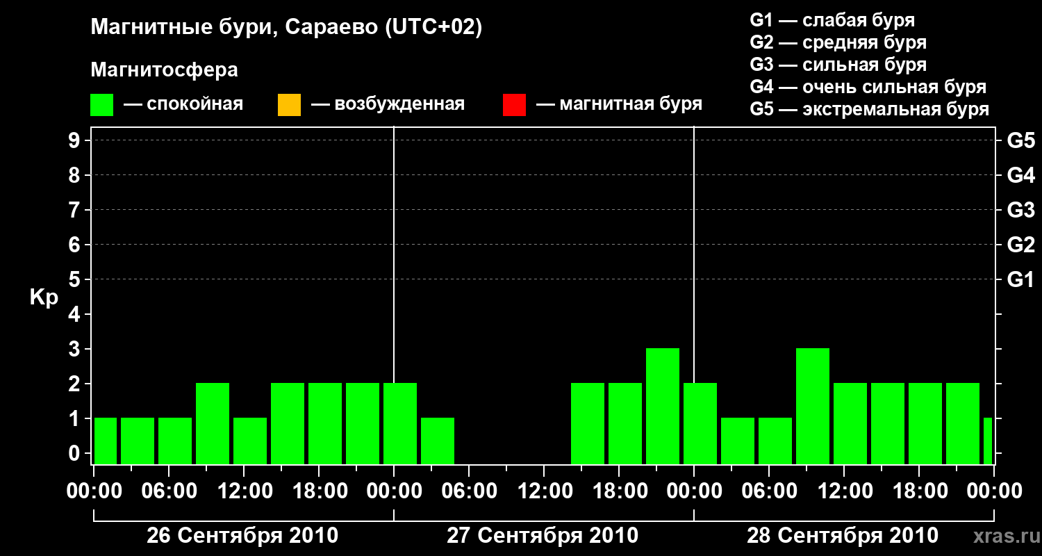 Изменения геомагнитного индекса Kp с 26 по 28 сентября 2010 года для средних широт
