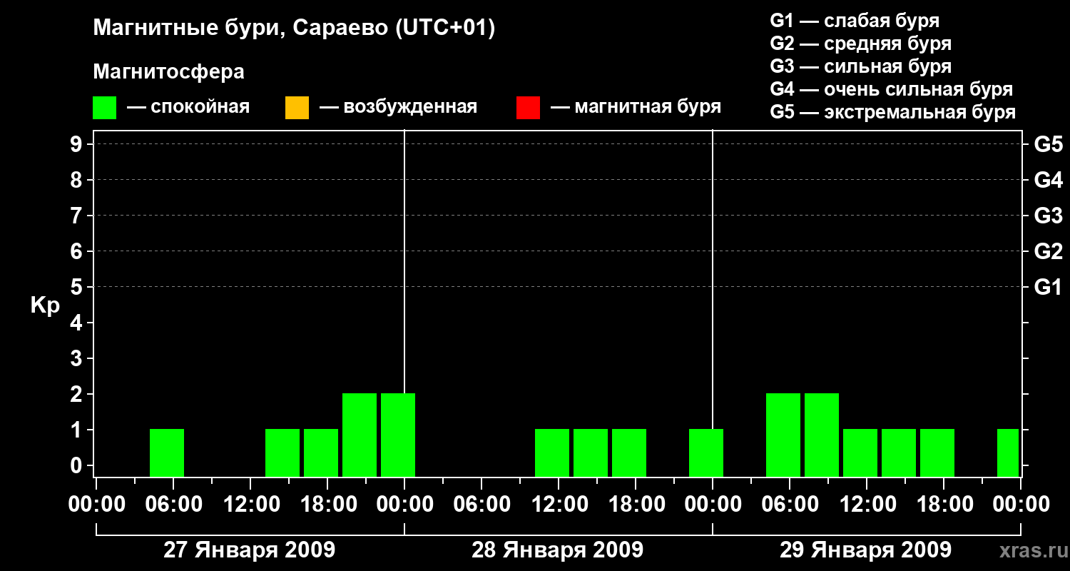 Изменения геомагнитного индекса Kp с 27 по 29 января 2009 года для средних широт
