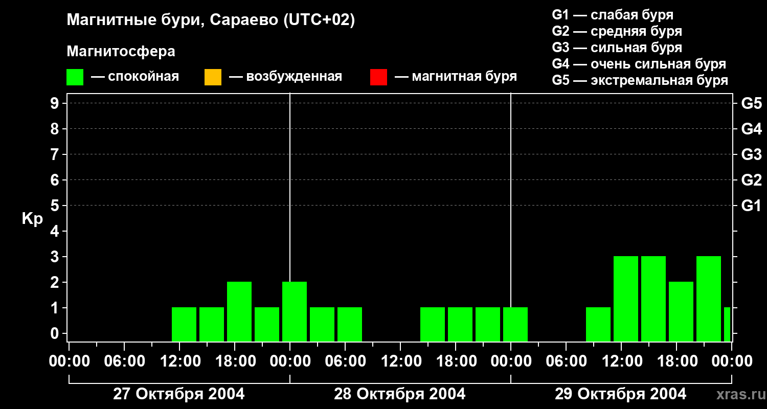 Изменения геомагнитного индекса Kp с 27 по 29 октября 2004 года для средних широт