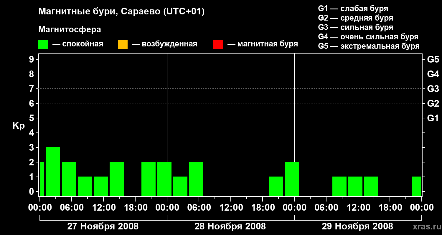 Изменения геомагнитного индекса Kp с 27 по 29 ноября 2008 года для средних широт