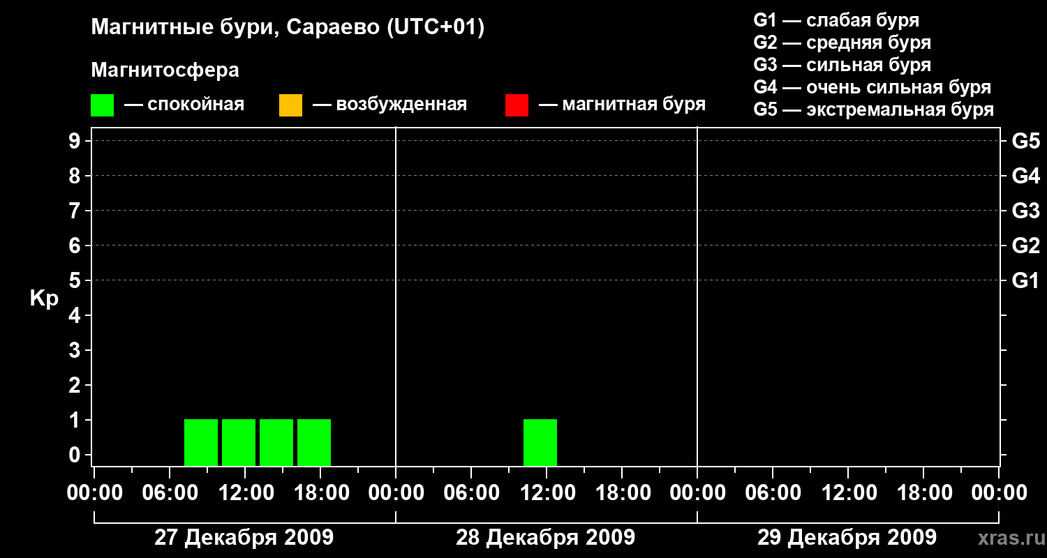 Изменения геомагнитного индекса Kp с 27 по 29 декабря 2009 года для средних широт
