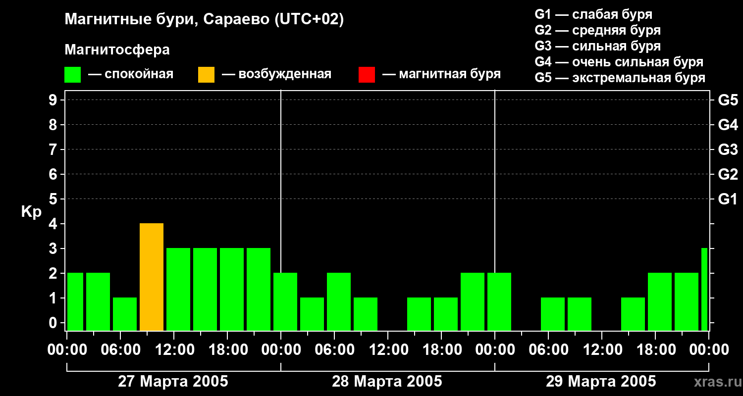 Изменения геомагнитного индекса Kp с 27 по 29 марта 2005 года для средних широт