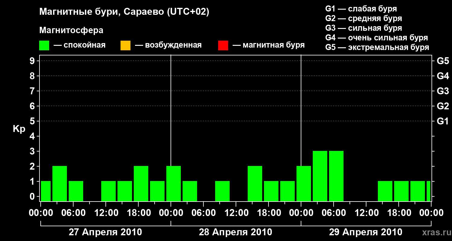 Изменения геомагнитного индекса Kp с 27 по 29 апреля 2010 года для средних широт