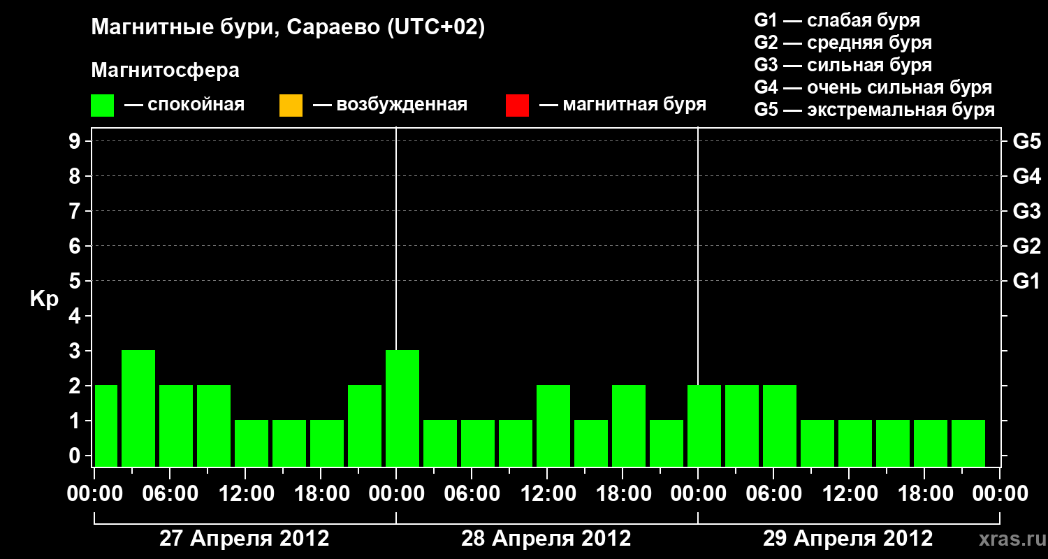 Изменения геомагнитного индекса Kp с 27 по 29 апреля 2012 года для средних широт