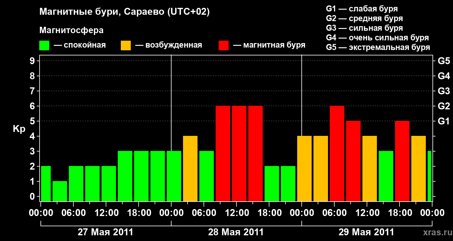 Изменения геомагнитного индекса Kp с 27 по 29 мая 2011 года для средних широт