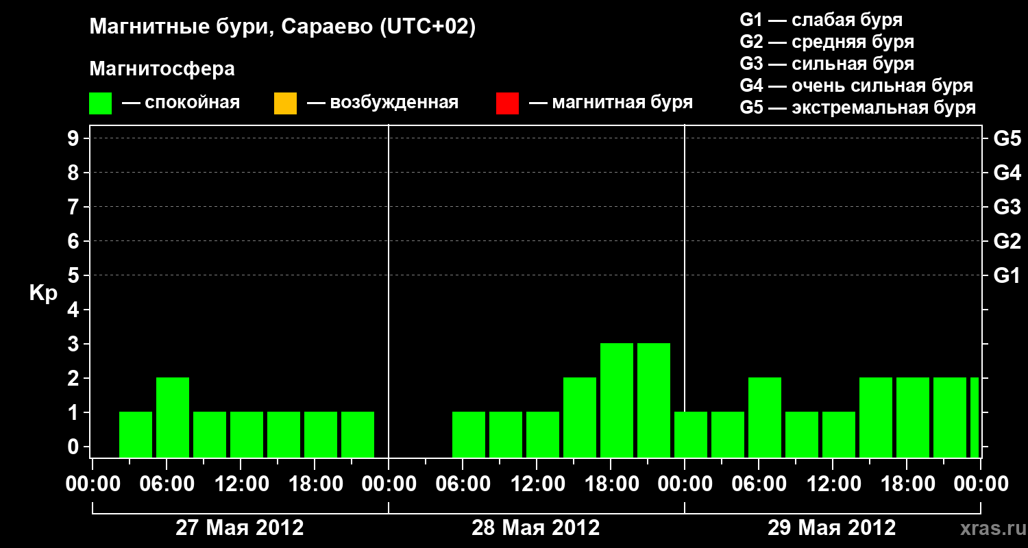 Изменения геомагнитного индекса Kp с 27 по 29 мая 2012 года для средних широт