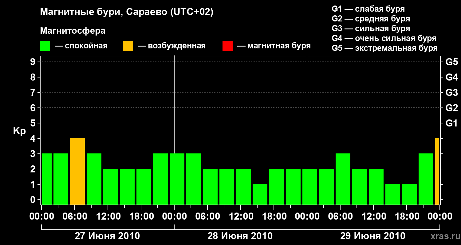 Изменения геомагнитного индекса Kp с 27 по 29 июня 2010 года для средних широт