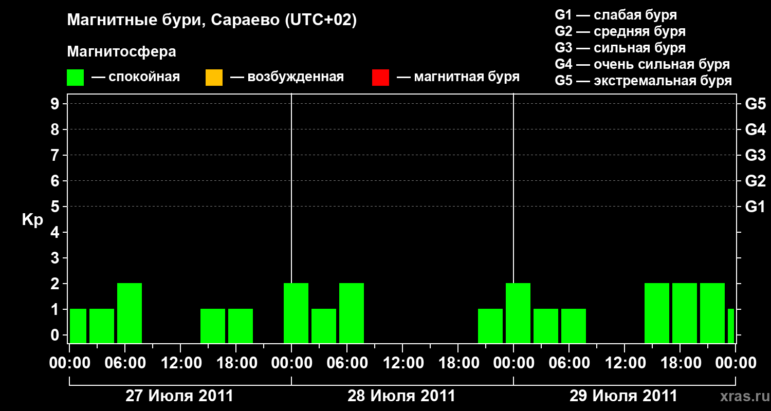 Изменения геомагнитного индекса Kp с 27 по 29 июля 2011 года для средних широт
