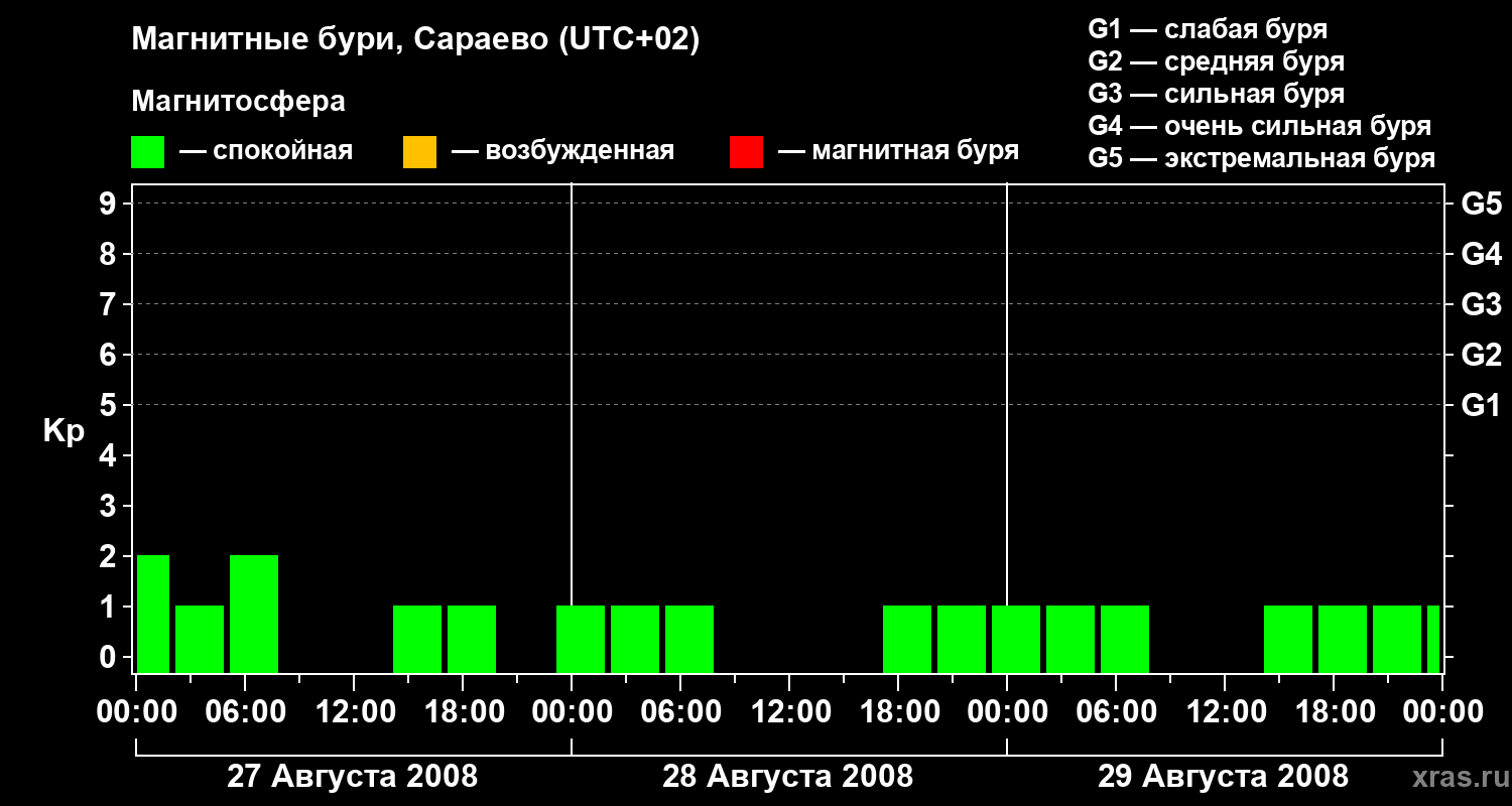 Изменения геомагнитного индекса Kp с 27 по 29 августа 2008 года для средних широт