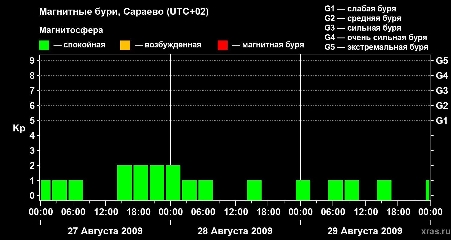 Изменения геомагнитного индекса Kp с 27 по 29 августа 2009 года для средних широт