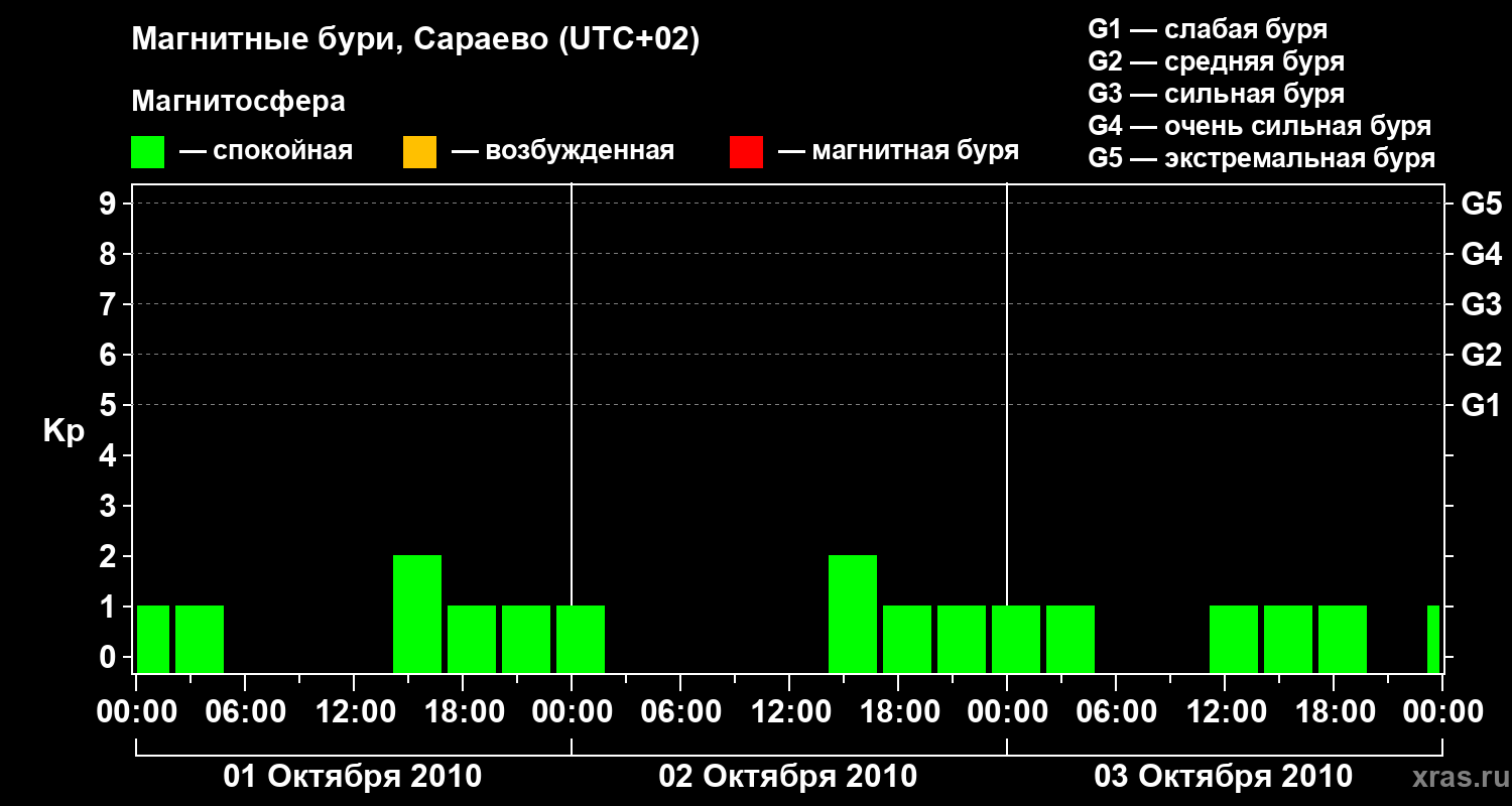 Изменения геомагнитного индекса Kp с 1 по 3 октября 2010 года для средних широт
